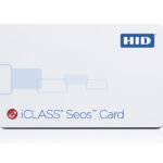 Eine weiรŸe iCLASS Seos Karte mit dem HID-Logo in der oberen rechten Ecke und einem roten Symbol links vom Kartennamen.