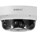 Überwachungskamera der Marke Wisenet in einem weißen Gehäuse.