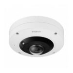 Eine weiße, runde Überwachungskamera mit dem Aufdruck "WISENET".
