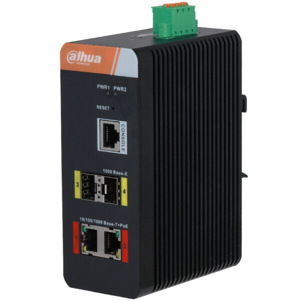 Der Dahua Managed PoE-Switch in Schwarz bietet zuverlässige Leistung mit 4 Ports, darunter 2 SFP und 2 PoE-Ports. Entwickelt für extreme Temperaturen von -40 bis 75°C, liefert er mit 48-57V DC eine stabile Versorgung. Mit einem maximalen PoE-Budget von 120W ist er ideal für anspruchsvolle Netzwerkumgebungen.