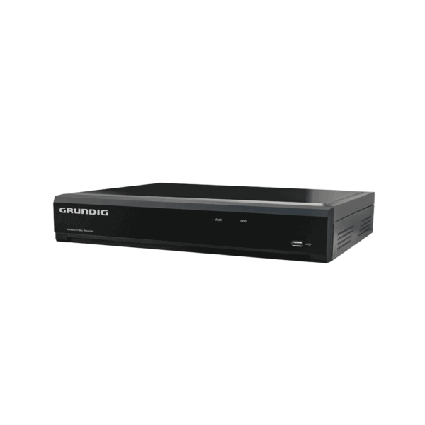 Technische Eckdaten auf einen Blick: IP-Rekorder, 32 Kanäle, bis 8MP, H.265+, 4x SATA (bis 10TB je Anschluss), 2x HDMI, 1x VGA, 1x USB3, 2x USB2, 16x Alarm In/1x Out, 1x Audio In/1x Out, 12V DC, max. 12 W, Farbe schwarz, Hersteller Grundig, Serie PROFESSIONAL.