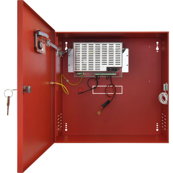 Pulsar EN54C-5A40LCD: Kompakte 27,6V/5A-Stromversorgung mit 142 W Leistung im roten Metallgehäuse (IP30) für Aufputz-Montage – ideal für zuverlässige Sicherheits- und Gebäudetechnik mit bis zu 40 Ah Akkupufferung.