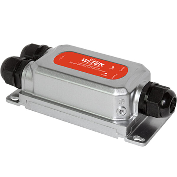 WirelessTek Outdoor PoE-Extender IP68 mit 2x PoE Out und 1x PoE In: Ein kompakter, silberner PoE-Extender im Metallgehäuse für zuverlässige Strom- und Datenverlängerung im Außen- und Industriebereich.