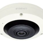 Eine runde, weiße Überwachungskamera der Marke Wisenet mit einem zentralen schwarzen Objektiv.